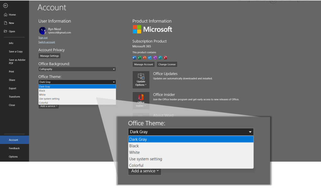 As you read through this guide, you may notice that my images may be a little different from your screen. All of my ribbons are gray. That’s because when I’m working, I like darkness and a screen that doesn’t blind me. Think of me as one of those movie monsters who can’t handle the sun or an overly bright monitor in this instance. Rather than have a blinding white screen glare at me, I use dark mode (Microsoft calls it Dark Gray) which makes everything gray and frankly easier on the eyes at least for me. My screenshots are from Word but this will also work PowerPoint, Excel, and Outlook. In fact if you have Office 365 making this change in one program will cascade to the others.