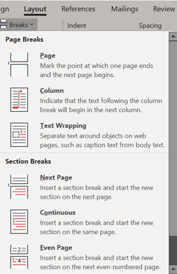The names here give away the functions. You can find all break options on the Layout ribbon in the Page Setup section. Select the drop-down option for Breaks.