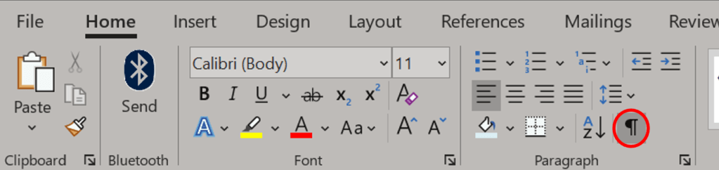 So, what’s their alternative to reveal codes? Word provides the Show/Hide option on the Home ribbon under the Paragraph section. It’s the little paragraph symbol. Click it once to toggle. (US Keyboard: Ctrl+Shift+8/EU Keyboard Ctrl+*)