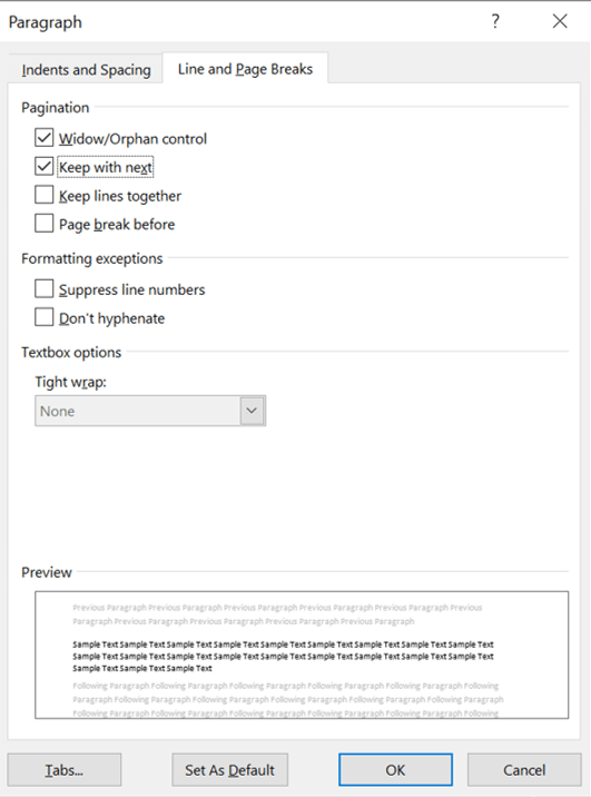 The listed setting options are found on the Home ribbon in the Paragraph dialog box, which is opened by clicking the box with a diagonal arrow. Move to the tab titled, Line and Page Breaks, and choose the desired option.
