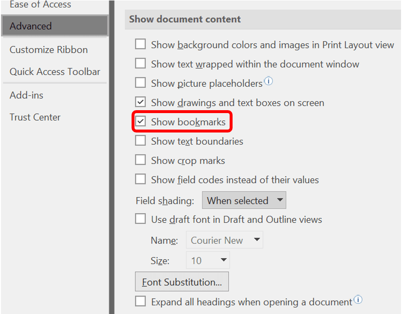 Bookmarks in Word identify places in your document you want to easily refer to in the future. Bookmarked locations/text allow you to jump to the point in your document without scrolling. If you’ve ever used bookmarks in a PDF, it has the same functionality. (This works in Outlook too!) You can insert as many bookmarks as you want in your document, but you’ll need to give each one a unique name so you can easily distinguish them. Bookmarked text will be denoted by square brackets [] around text. If the Show/Hide button does not reveal bookmarks, click the File tab. Then choose Options. A pop-up menu will appear. In the left pane of that window, click Advanced and scroll to the Show document content section where you’ll check Show bookmarks.
