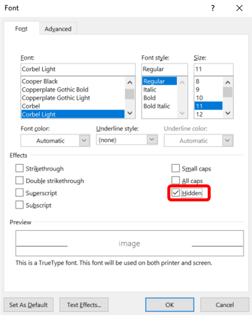 If you want to hide an image, insert the image first. The image must have In line with text wrapping applied to it. This will not work with other wrapping options. Now select the image to be hidden. On the Home ribbon under the Font group launch the Font dialog box.