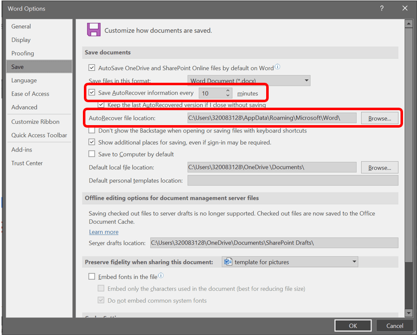 If you need to change the frequency of AutoSave go to the File tab and click Options on the left (you may need to scroll down to see it). The Word Options menu will appear. Click on Save which appears to the left of this menu. Under the first section titled Save documents, the second checkbox, for Save AutoRecover information every allows you to change the frequency. From here you can also change the location of where the Word places the AutoRecover file. Only do this is if you’re an advanced user.