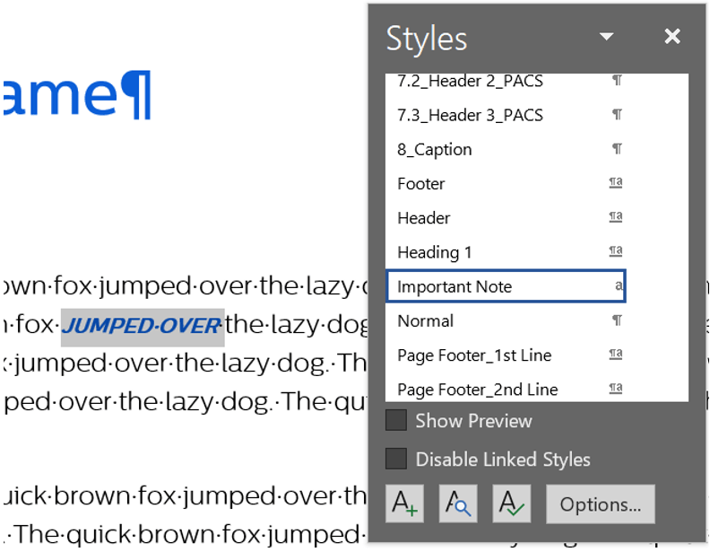 Character styles are marked in the style task pane with a character symbol (a). Click anywhere in a single word to apply the style to the entire word. You can also click and drag to select multiple words and apply the style to all the words at once.