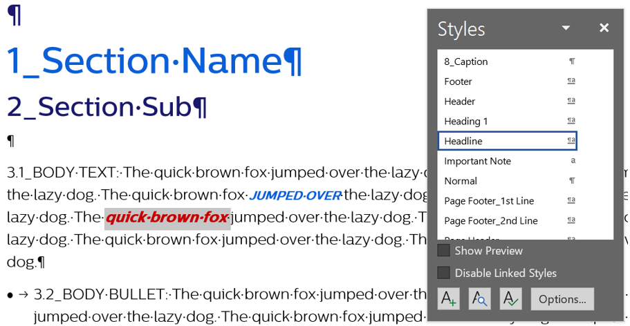 However, if you select a word or a phrase and then apply Headline, the text that you selected is formatted with the text characteristics of the Headline style, but none of the paragraph characteristics are applied.