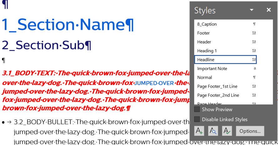 How is this useful? Consider the scenario above, in which an Alert character style and a Headline paragraph style each format text as bold and red. If the Headline style was a linked style instead of a paragraph style, you would not need a separate character style for formatting words and phrases. For example, if you select (or click inside of) a paragraph and apply the Headline (linked) style, the entire paragraph is formatted with the Headline text and paragraph characteristics.