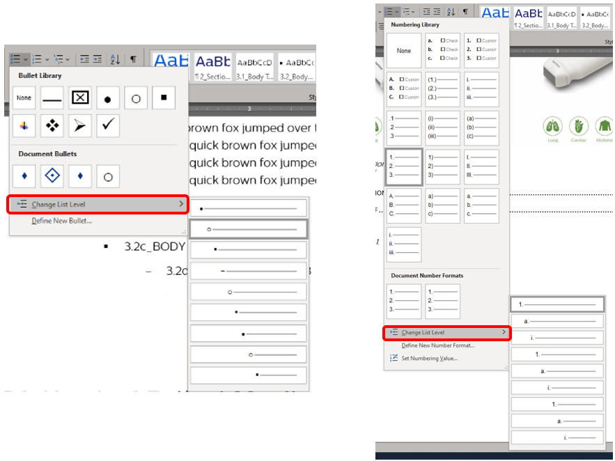 Lists, like the Table of Contents, are based on hierarchical outline levels in a tree structure. There are two ways to change levels in a list. One way is to press the Tab key at the beginning of the line until you’ve reached the level down (toward the right) you want or Shift+Tab to move up (toward the left). You may also select (or leave your cursor by clicking) the text you want to move to a different level and go to the Home ribbon. In the Paragraph group, click the arrow next to Bullets or the one next to Numbering to open the library. Click Change List Level near the bottom. Then select the desired level from the drop-down menu.