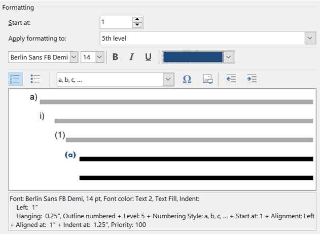 From the Apply formatting to dropdown, pick the list level to which your style will apply. This level will appear in black, as opposed to the gray levels, as shown in the preview provided below this section. For instance, if you move from the default of the 1st level to the 5th level, the preview will update to show what the 5th level currently looks like in black, even if all your text is in blue.