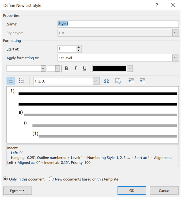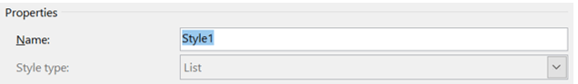 From this window, in the Properties section, you may insert a name for your new list style. The Style type is grayed out, as the type will always be List in this window. If you were to create a New style from formatting, you could choose List from the Style type dropdown and the window would transform to look like the images in this section.