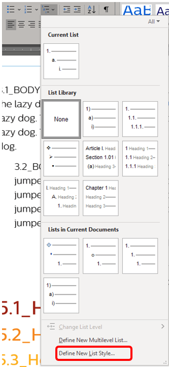 Think of this as a quick style for the Style Gallery but specifically tailored to lists. From the Home ribbon, in the Paragraph group, click the down arrow button next to the Multilevel list option to find Define New List Style.
