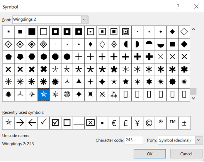 Clicking the Omega (Ω) will open the Symbol popup (same as the one found on the Insert ribbon in the Symbols group). Scroll through the list until you find the symbol you want to use, then click OK. This will turn the chosen level into a bullet with that symbol.