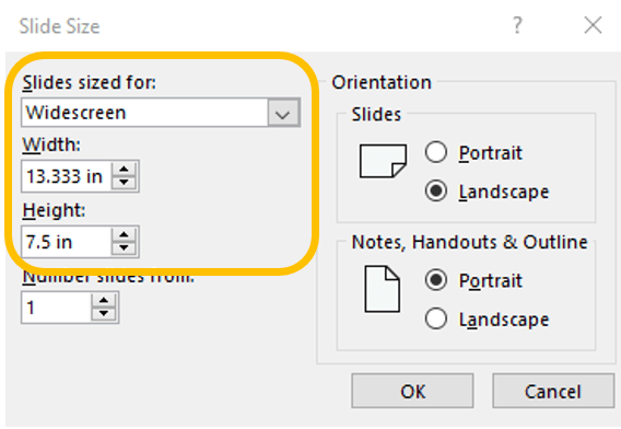 If these don’t fit you don’t have to click the Custom option. You can specify the Width and Height and the system will change the Slides sized for to Custom.