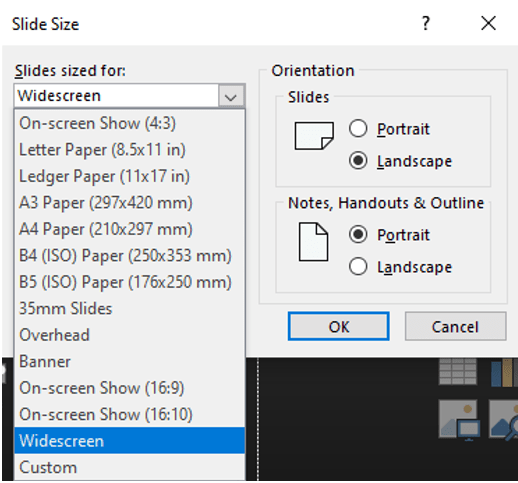 On the left side of the dialog box, if you click the dropdown for Slides sized for, you’ll see basic paper sizes to choose from.