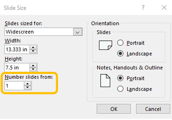 From here you may also alter the page/slide numbering to start at a number other than one.