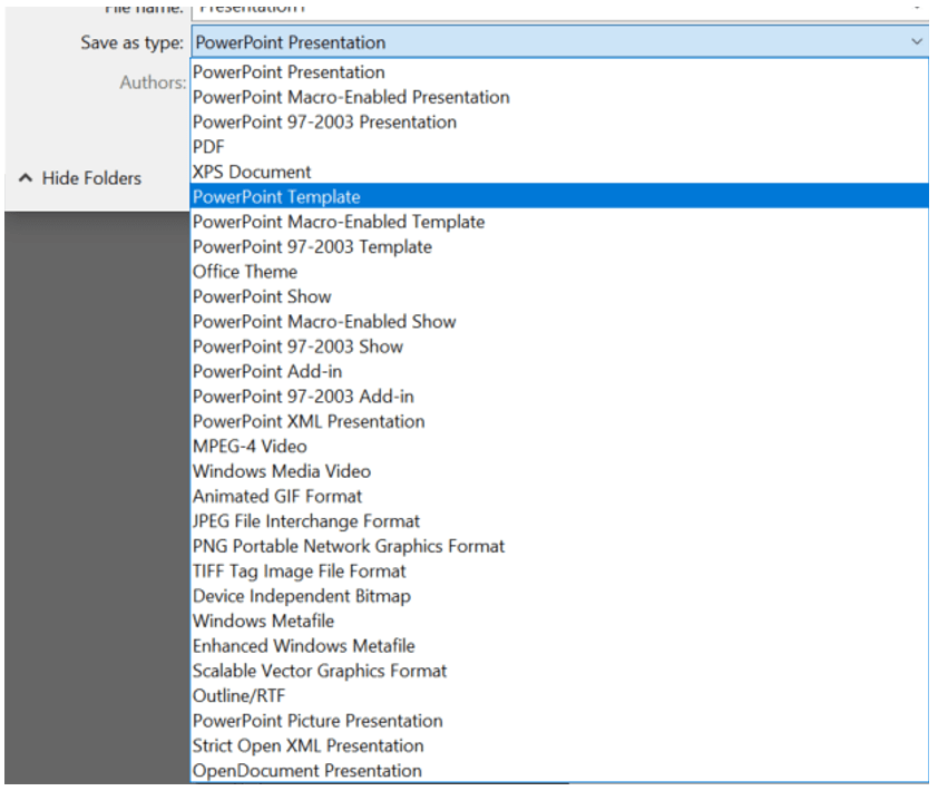 Chose PowerPoint Template (watch out because there are also options for a PowerPoint Macro-Enabled Template and the PowerPoint 97-2003 Template).