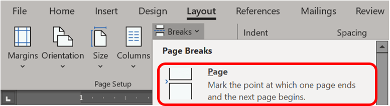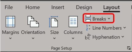 2. On the Layout ribbon, select Breaks from the Page Setup group. Then from the dropdown menu, click Page.