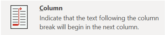 You know when you’re writing in columns, and you just want that last line you typed to move to the next column? You could press Enter a bunch, but then your formatting will be messed up if you edit your text later, and you’ll be deleting returns while annoying yourself. A better way is to insert a Column Break. This will move the cursor to the next column to the right, leaving your previous text in the first column. If you go back and add more text to the first column, it’ll populate the same column unless you add so much that you overflow the column.