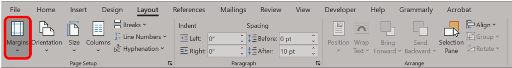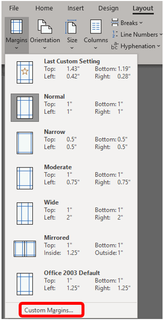 A dropdown menu will appear that will allow you to adjust the margins either by presets or, if you want to customize by manually entering your margin sizes, choose Custom Margins at the bottom.