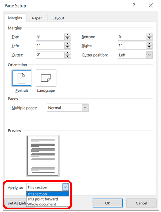 The Page Setup dialog box will appear and will open on the Margins tab. From here, enter your dimensions applying either to the section you are working in or to the entire document.
