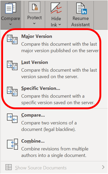 Say you’re working on a shared drive and multiple are working in a document, but you want to see what changed from a prior iteration of the document. To compare changes from a prior version head to the Review ribbon then to the Compare group. You’ll note the first three options talk about versions.