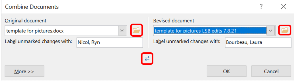 Select the file from which you want to compare from as the Original Document either from the dropdown list, clicking Browse in the dropdown list, or click the wee folder icon next to the file name to browse for it. Then select the file for comparison, such as the document emailed to you without any changes tracked, under the Revised Document dropdown list. Again, you can click the file name in the dropdown list, clicking Browse in the dropdown list, or click the wee folder icon next to the file name to browse for it. Word auto-fills the Label changes with fields. You may change this label only after Word has created the initial label. If you messed up, and you want to reverse how you want the documents to be compared click the swap button. Click OK when you are done.