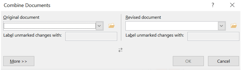 The Combine Documents dialog box will appear. You’ll notice from a visual standpoint it looks exactly like the Compare Documents dialog box so be careful when you use this tool to ensure you have chosen the correct option.