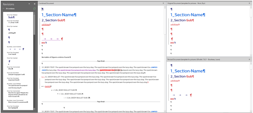 You may have noticed this looks very much like the Compare option. Although Compare and Combine appear to provide the same functionality, there are distinct differences between the two options. Compare should be used when examining the differences between two documents, whereas Combine should be used when you need to compare two or more documents as well as identifying who changed what in the document. Notice Compare only gives us one editor of all the changes whereas Combine notes a difference in the two editors.