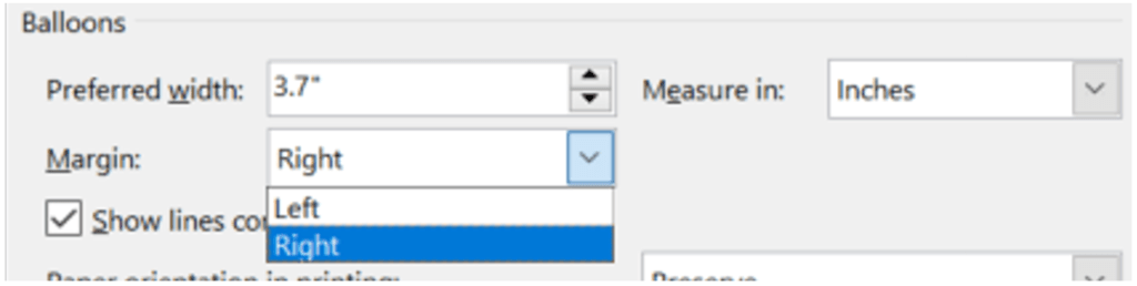Finally, if you want to print a version of your document that displays tracked changes know that Word will shrink the document in size to fit the sidebar with comments. If you don’t want all your text minimized to fit the change balloons, under Paper orientation in printing you can Force Landscape.