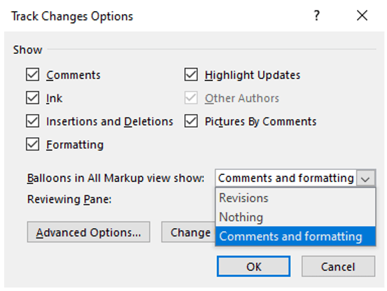 Now if you have too many author colors making you go blind, or you want to alter how changes appear, or maybe the size of the balloons, in that dialog box click Advanced Options to open one of the two versions below of the Advanced Track Changes Options dialog box.