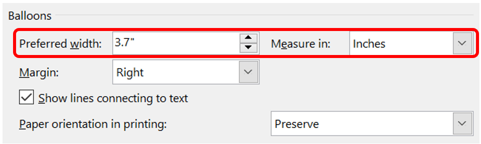 Under Balloons, you can set the width of the balloons by typing in your Preferred width or change Measure in from Inches to Percent and set a percentage of the paper that you want the balloons to cover.