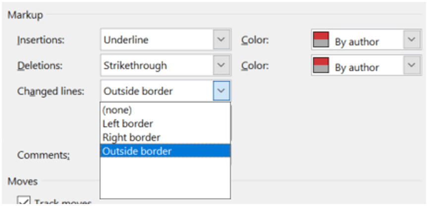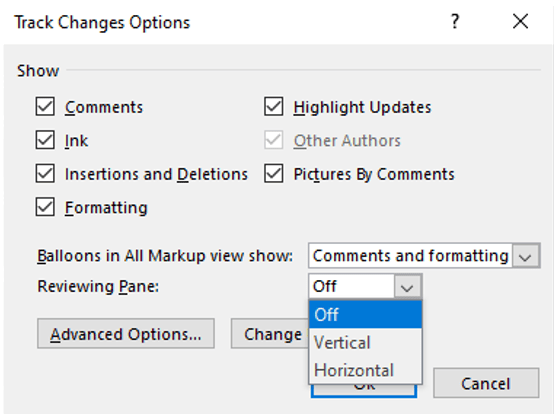 You will then be presented with, drum roll, the Track Changes Options dialog box.