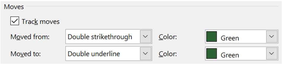 Under Moves, enable the Track Moves options to make Word record movement of content across the document. You can further customize the way Word shows any recent movements of content. You will be able to observe if the content is Moved from or Moved to somewhere else in the document, by selecting different colors.