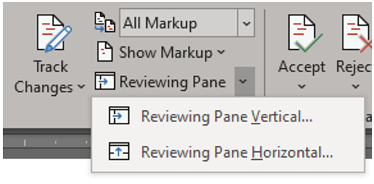 From this window, you may also toggle the Reviewing Pane on or off. Use the dropdown menu to toggle and set how on the screen it will appear.