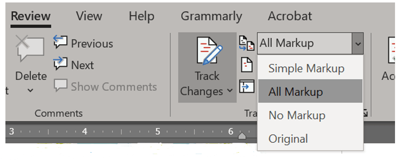 If markups such as these get to be too many and you just want to see the old or final version of the document, or if you want to revert to the original document, use the Display for Review dropdown, in the Tracking group, to specify how you want to see the document. You can identify this menu by looking for the text “All Markup.”