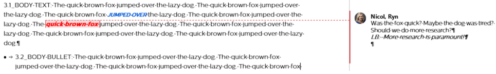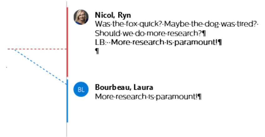 In the example below, you’ll notice Laura (LB) has responded to my comment within the same bubble. If we were to isolate reviewers so that we only viewed original edits and comments by Laura, this comment would be filtered out as Word tracks this as my comment, not Laura’s comment.