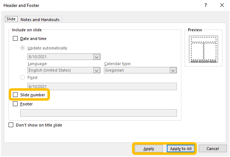 This will open the Header and Footer dialog box which has two tabs, Slide and Notes and Handouts. It will open on the Slide tab where you can check the boxes to include the Date and time, Slide number, and the Footer. The last check box allows you to remove these from any slide with the Title slide layout. To add slide numbers, check the corresponding box. When you’re done, click either Apply to active on one slide or Apply to All for, duh, all slides.
