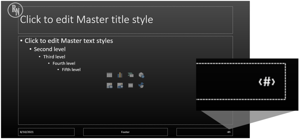 Now that we’ve made our logo, we can add slide (page) numbers, but wait. It would appear that slide numbers are already there. That little hashtag/pound symbol/number symbol inside parenthesis is for slide numbers. So, it’s already there… right?