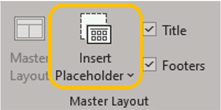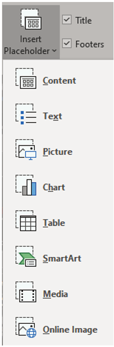But if you want to be specific about the type of content, on the Slide Master tab in the Master Layout group click the dropdown for Insert Placeholder.