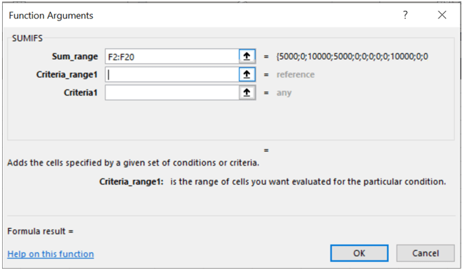 You will return to the full Function Arguments dialog box. Your Criteria must be listed on the spreadsheet so that the system can view a range for that Criteria. This area will be the Criteria_range1. This limitation does not change whether you are working with text or values. In fact, SUMIFS works best with text in mind.