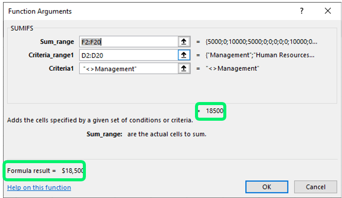 At this point, we’ve created an alternative to the example we used in SUMIF to determine the total of bonuses paid to managers but with the following formula. Notice we used the equals sign this time.
