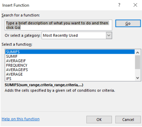 The Insert Function dialog box will appear. If you have used the function recently, it will appear on the list where you can click it and then click OK. Otherwise, type in the box where indicated the function you want to use.