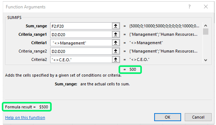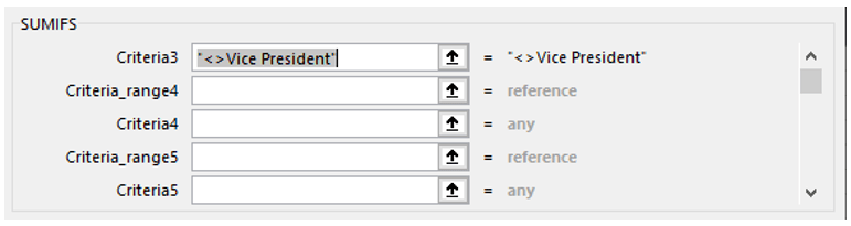 | SUMIFS multiple criteria | =SUMIF(sum_range, criteria_range1, criteria1, [criteria_range2, criteria2], [criteria_range3, criteria3],…) | =SUMIFS(F2:F20,D2:D20, “<>Management”,D2:D20,”<>C.E.O.”,D2:D20,”<>Vice President”) |