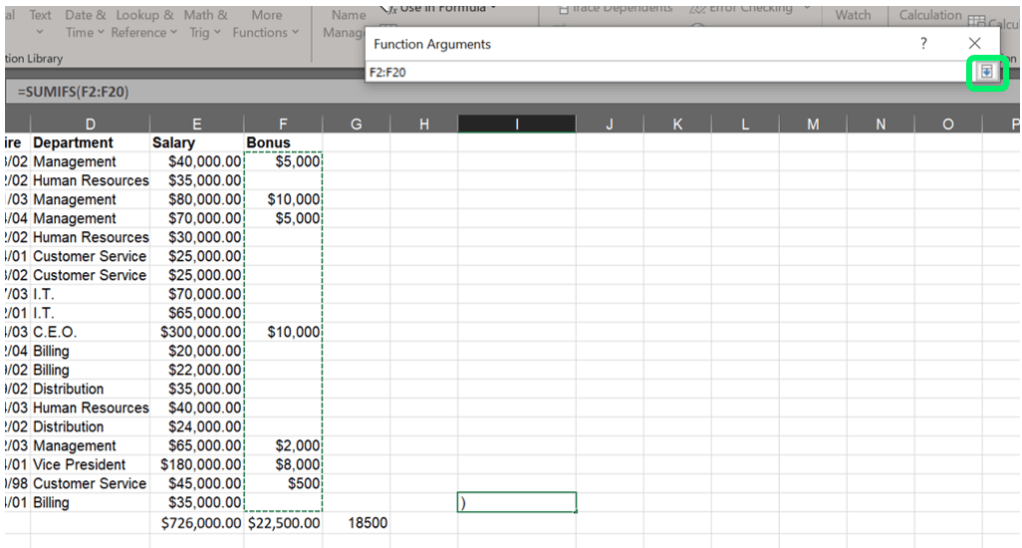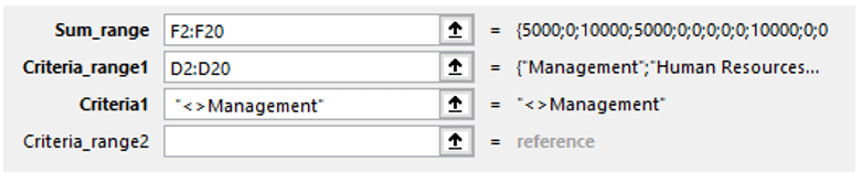 If you recall, however, we decided we want to see all bonuses paid to those not in any kind of management role, which would include the CEO and VP. This is where further criteria and ranges come into play. When you clicked on Criteria1, an optional Criteria_range2 appeared. That range is on our spreadsheet, so we’ll use the up arrow again.