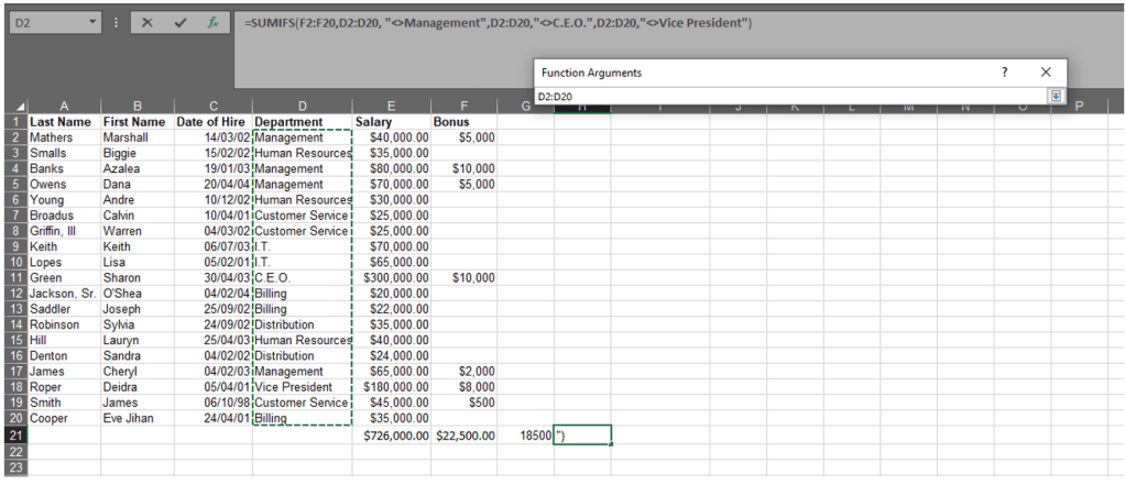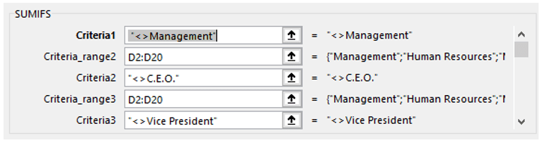 =SUMIFS(F2:F20,D2:D20, “<>Management”,D2:D20,”<>C.E.O.”,D2:D20,”<>Vice President”)