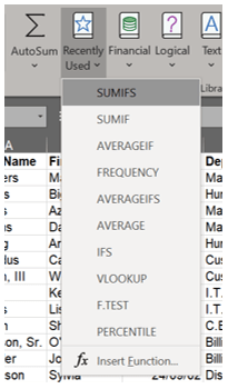Note: If you’ve recently used this function, navigate to the Formulas ribbon in the Function Library group. rather than clicking the dropdown by the sigma symbol (Σ) for AutoSum, You’ll see a star icon titled Recently Used. Use the dropdown here to select the desired function.