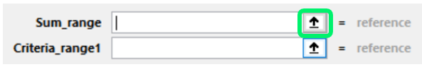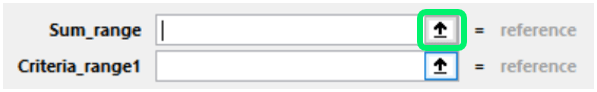 You’ll note Sum_range is now a required field along with Criteria_range1. Remember that all mandatory minimum requirements are bolded. For this function to work, you must have at least these lines complete. The Sum_range is the area of cells that will be added together. Click the up arrow to the right of the Sum_range box.