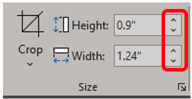 Within the Picture Format tab in the Size group, you may use the Shape Height and Width buttons to nudge the image size vertically or horizontally. Otherwise, type in specific values for the image’s size.