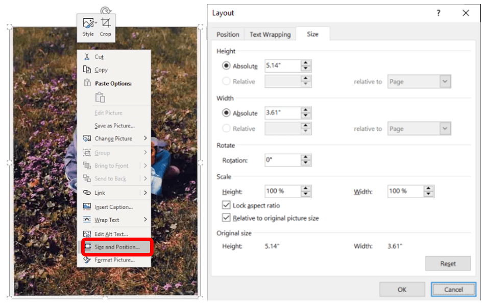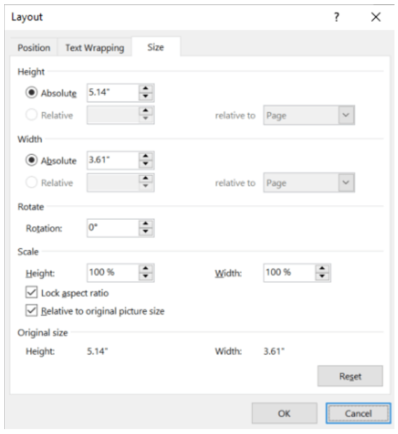 Here, you can check or uncheck the box for lock aspect ratio, change the size of the image, or change the rotation of the image. You also have the option to right-click any image and click Size and Position to alter the image, which will open the Layout popup.