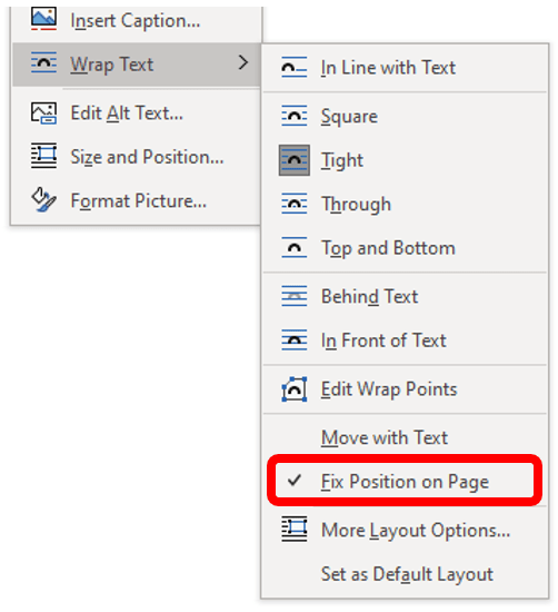 Normally, images will anchor with the text you put them with. If you want an image to stay in a specific spot on the page, regardless of text changes, click Fix Position on Page. This will toggle off Move with Text.