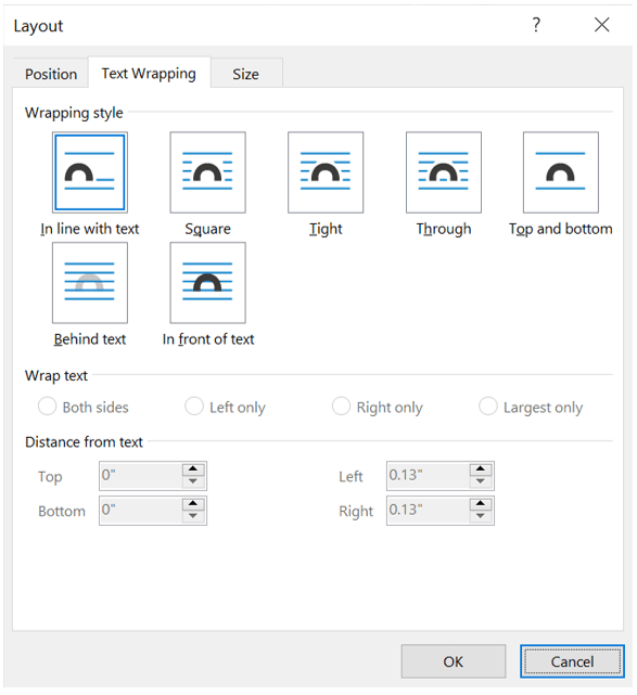 Selecting More Layout Options (or See more…) summons the Advanced Layout dialog box, which provides custom controls for image Position, Size, and Text Wrapping (default opening tab).